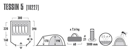 Zelt Tessin 5. Das Familienzelt mit 190cm Stehhöhe für die junge Familie in bekannter Kuppelform. Der Vorbau dient als Wohnbereich oder Spielplatz für Kinder. Die Wassersäule von 2.000mm schützt bei Regen. Die Klarsicht-Folienfenster bringen Helligkeit in den Raum bei wolkenbedecktem Himmel. 2 Eingänge erlauben ein flexibles Öffnen zur wettergeschützten Seite. Innenzelt-Taschen für Utensilien und ein Lampenhalter für eine Campingleuchte oder Taschenlampe runden den Komfort ab. Dauerventilation belüftet das Zelt für erholsamen Schlaf. Der Eingang mit Moskitonetz-Fenster hält lästige Plagegeister fern. Die Nähte sind mittels Nahtband wasserdicht versiegelt und gewähren eine bessere Naht- Reißfestigkeit. Das Tessin 5 bietet bis zu 5 Personen Unterkunft und eignet sich ideal für Camping-Einsteiger und junge Familien. Material- und Artikeldetails: Außenzelt: 100% Polyester, PU beschichtet, Nahtband versiegelt Wassersäule: 2.000 mm Innenzelt: 100% Polyester, atmungsaktiv Boden: 100% PE Gestänge: Fiberglas Aufbaumaß: 390 x 310 x 195 cm Innenzelt: 220 x 300 x 190 cm Gewicht: 7,2 kg Packmaß: 60 x 21 x 21 cm. Lieferumfang:inklusive Tragetasche, Heringe, Abspannleinen sowie Aufbau- und Pflegeanleitung. Farbe: blau